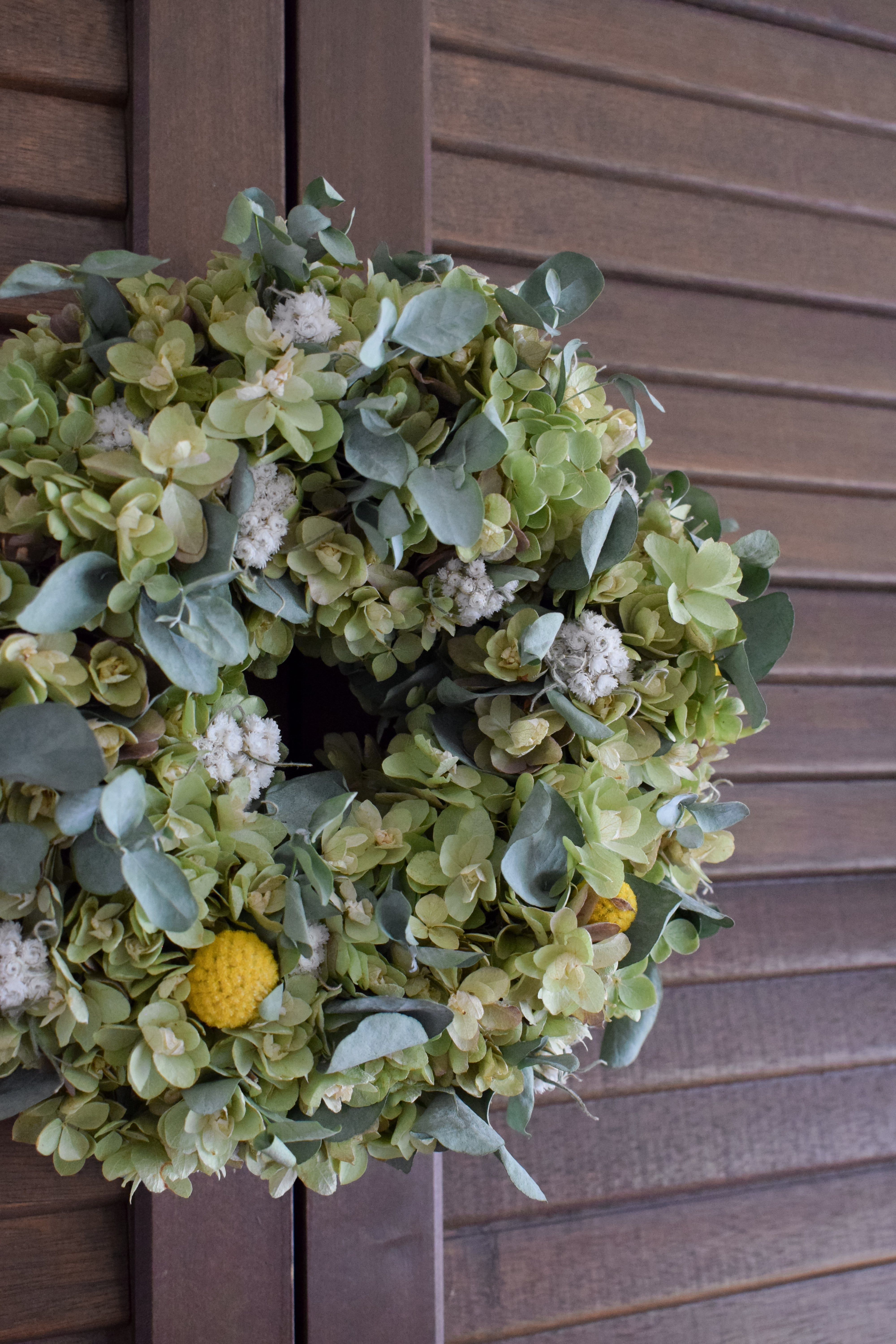 neriのお庭と素敵なお庭をお持ちのご近所さん家で採れたアナベルとカシワバアジサイを贅沢に使い、爽やかなみどりのリースを仕立てました。