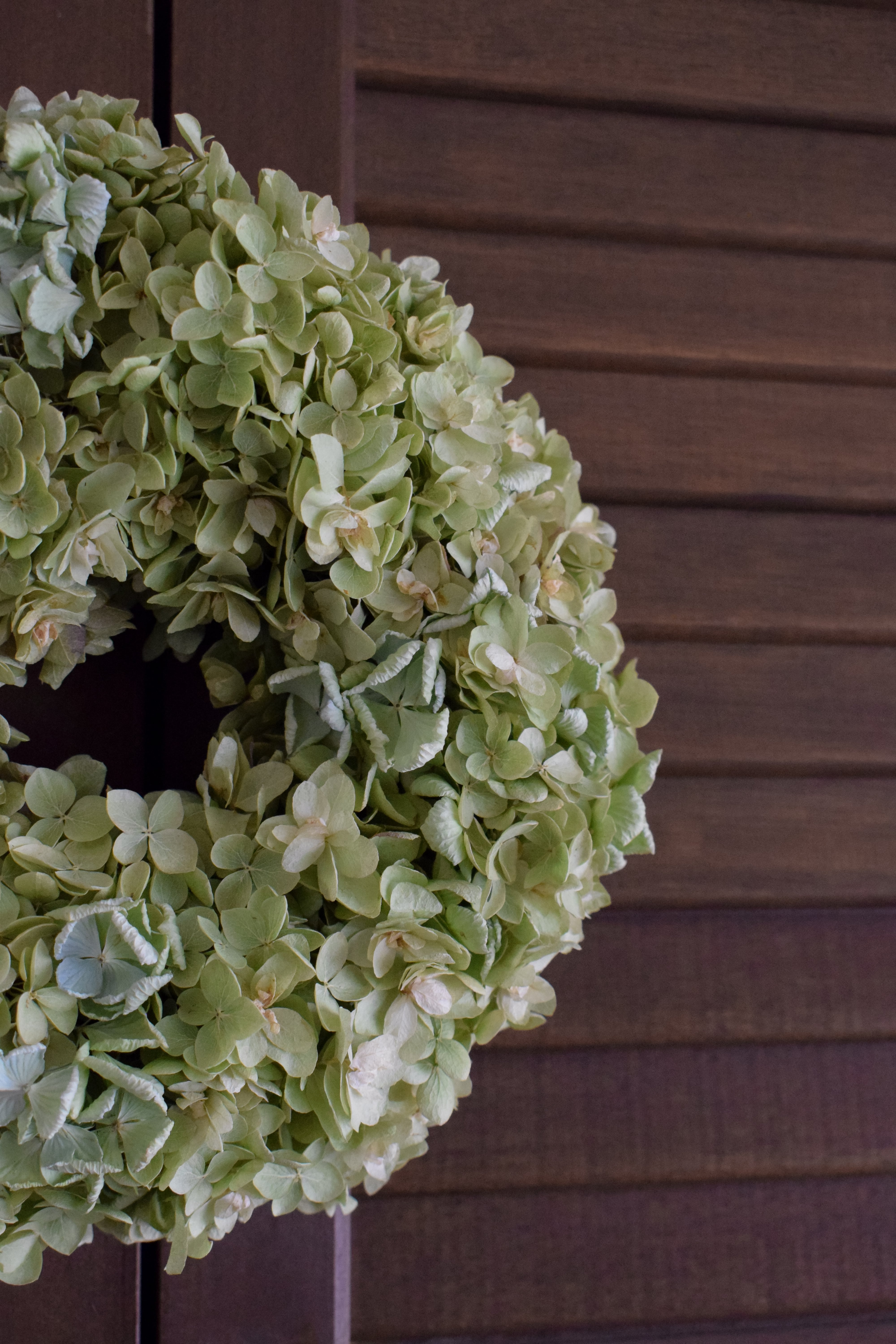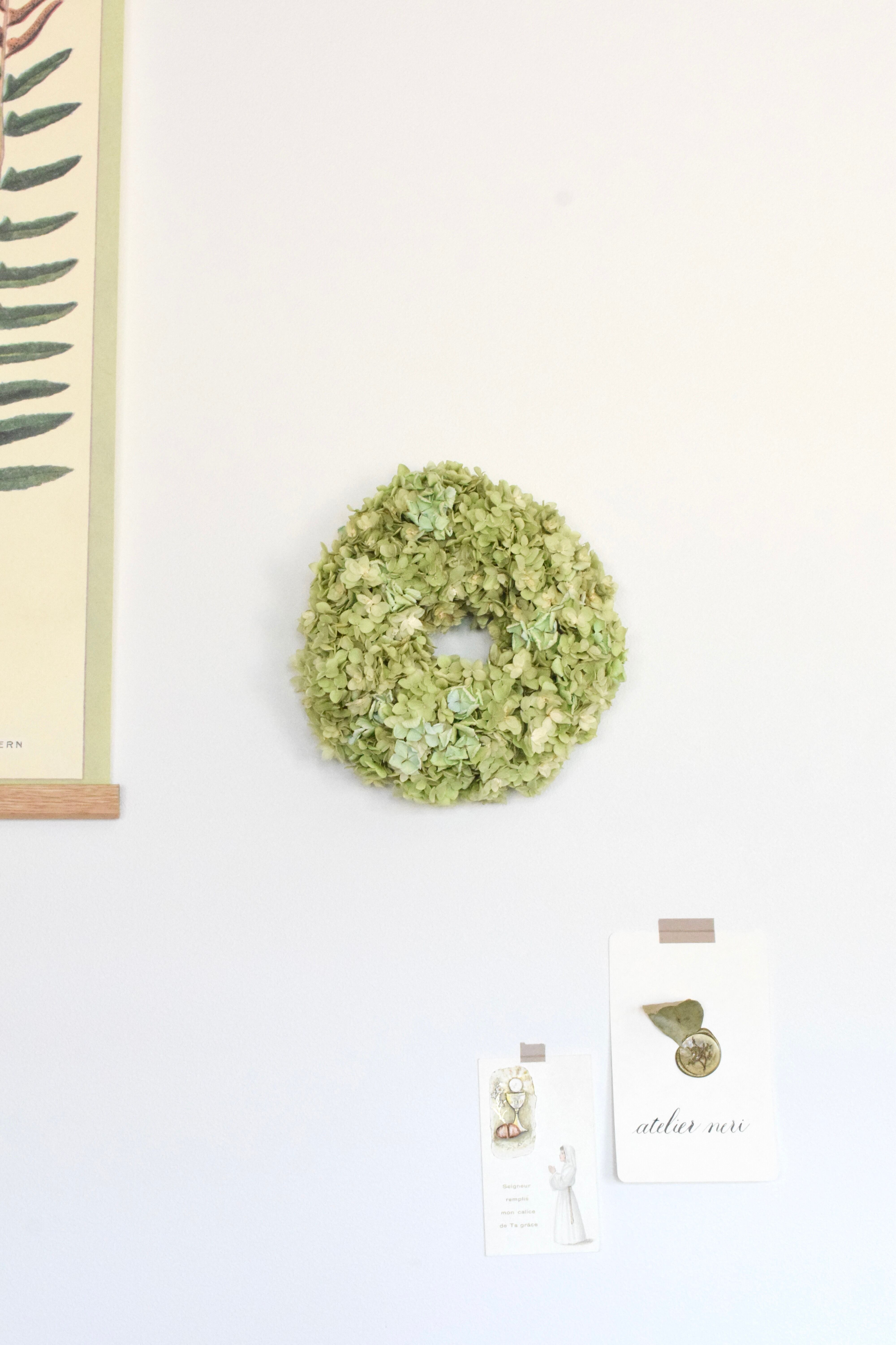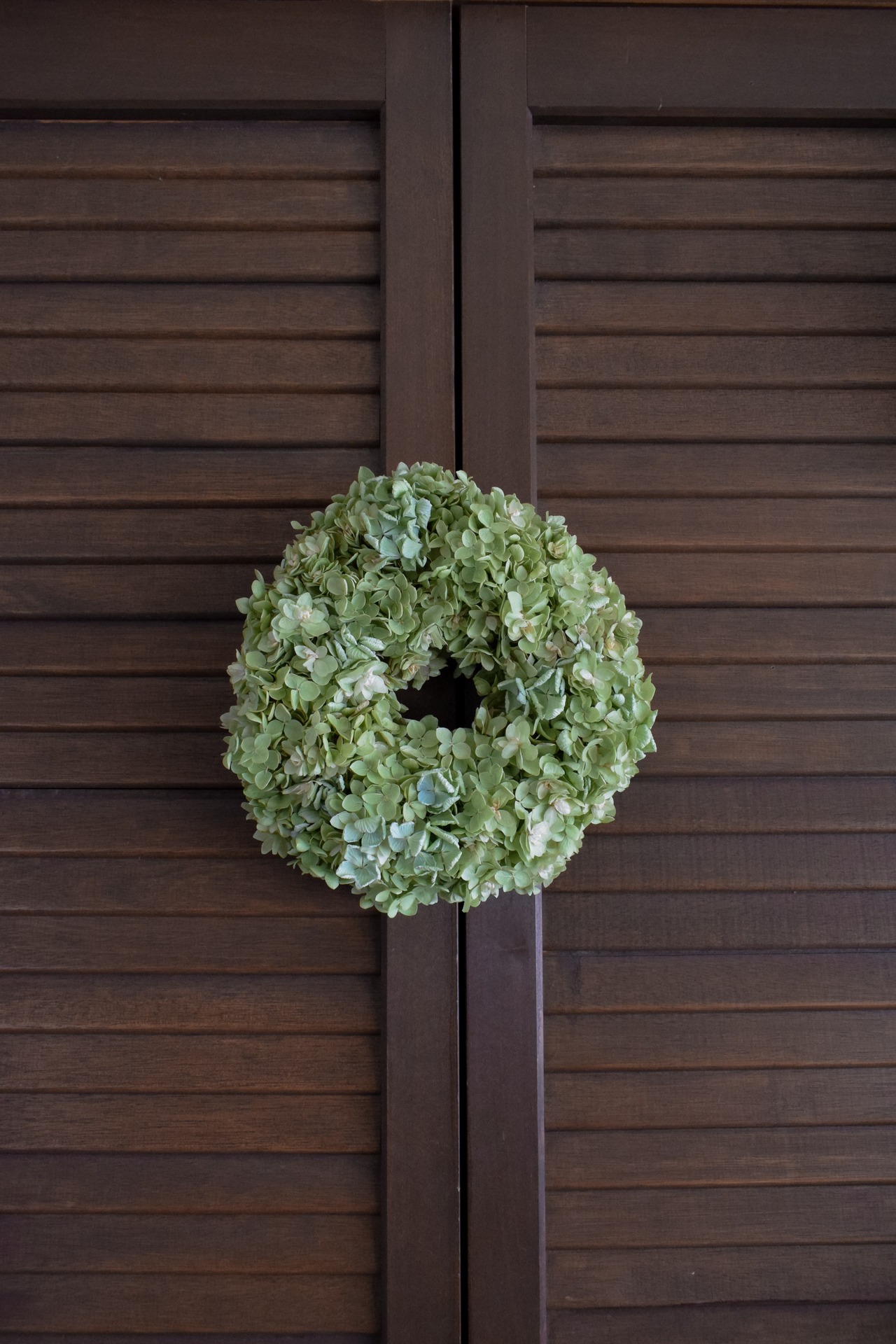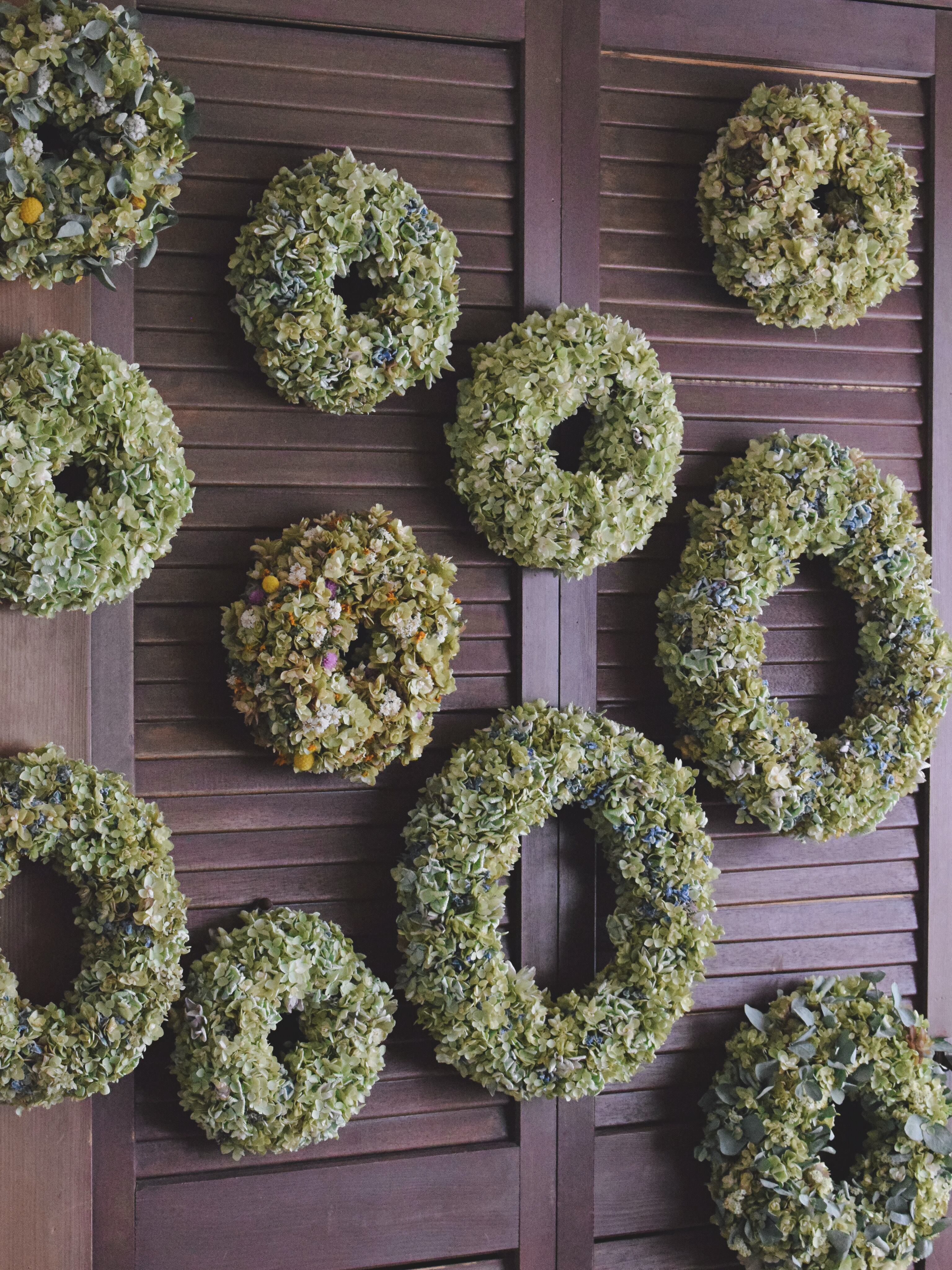 neriのお庭と素敵なお庭をお持ちのご近所さん家で採れたアナベルとカシワバアジサイを贅沢に使い、爽やかなみどりのリースを仕立てました。