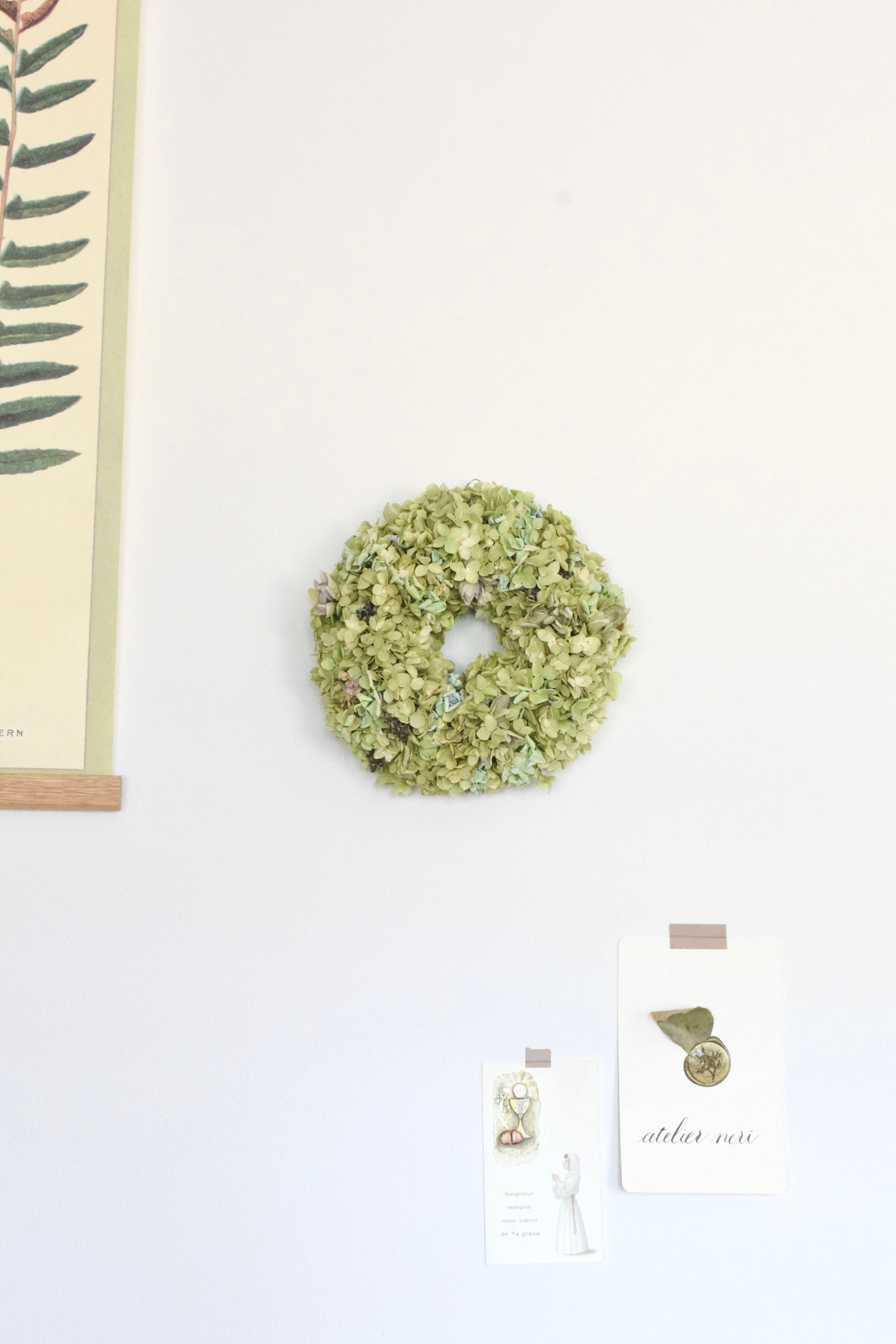 neriのお庭と素敵なお庭をお持ちのご近所さん家で採れたアナベルとカシワバアジサイを贅沢に使い、爽やかなみどりのリースを仕立てました。